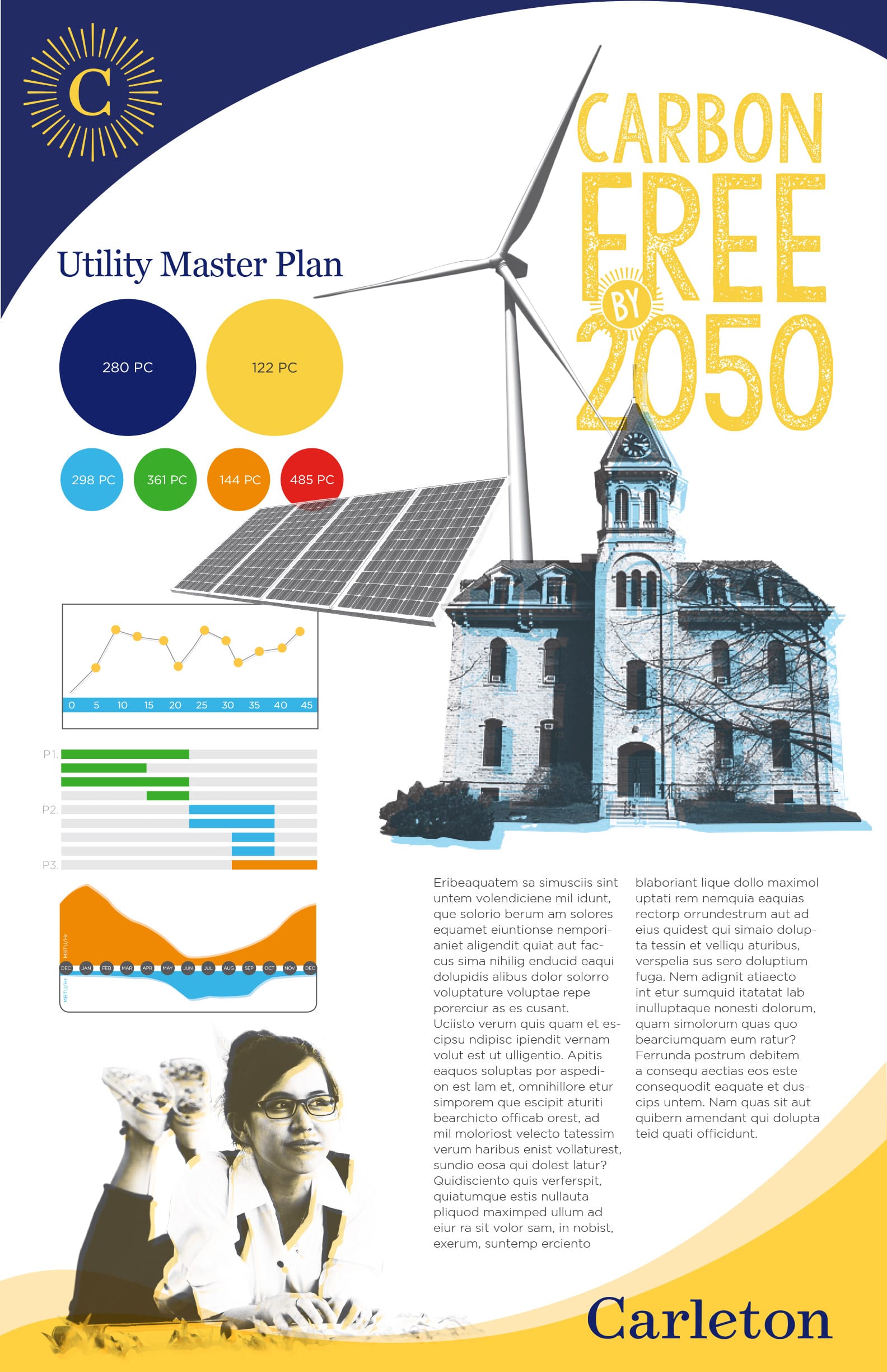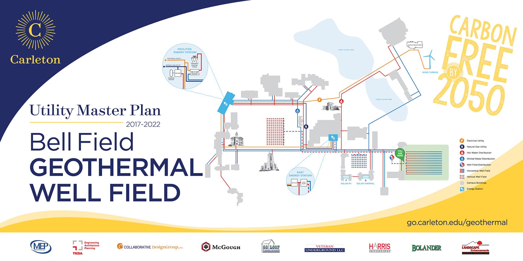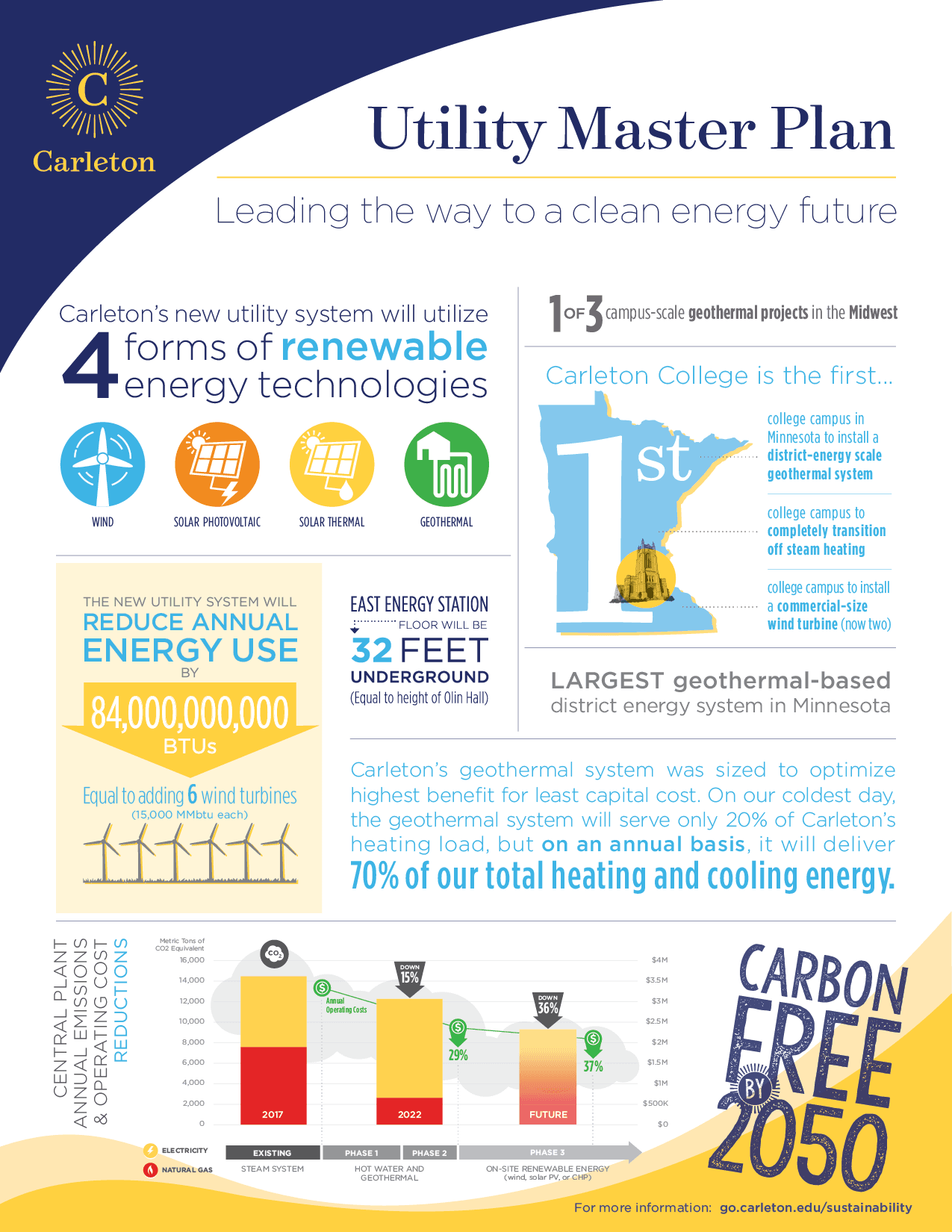 In 2017, Carleton College began major campus construction to install a new geothermal system and upgrade aging heating and cooling infrastructure as part of its Utility Master Plan. To keep students, staff, and visitors informed—and to show how these efforts supported the goal of becoming “Carbon Free by 2050”—my partners and I at Humbleweed Creative developed an identity and toolkit of graphics, charts, icons, and imagery for the 5-year project and beyond. These visuals were applied across construction signage, banners, handouts, web pages, and presentations.
