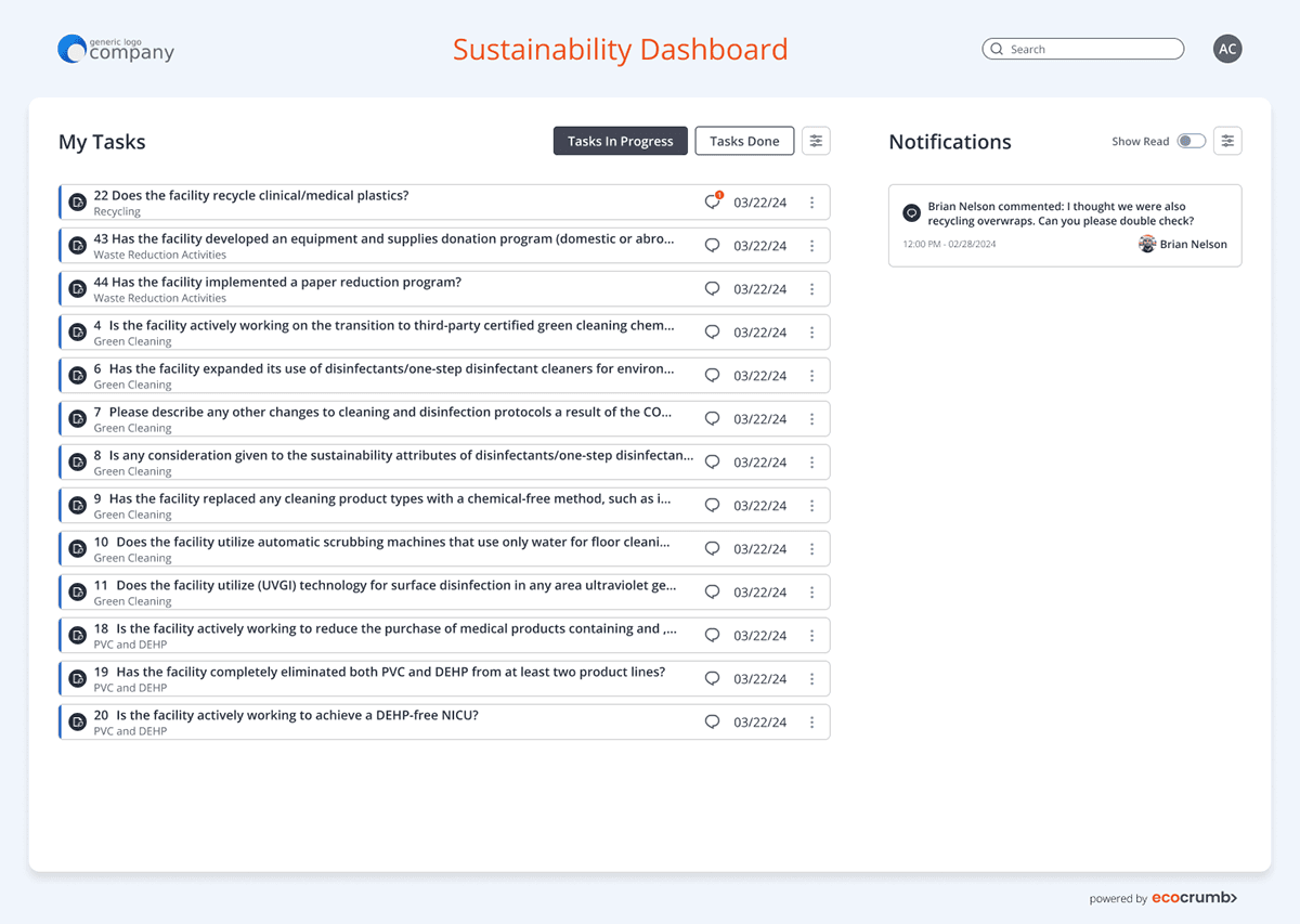 Ecocrumb is an award-winning, Techstars-backed SaaS company that helps healthcare systems centralize their sustainability data, manage key metrics, and simplify stakeholder communications—enabling hospitals to reduce waste, cut costs, and integrate sustainability into daily operations.