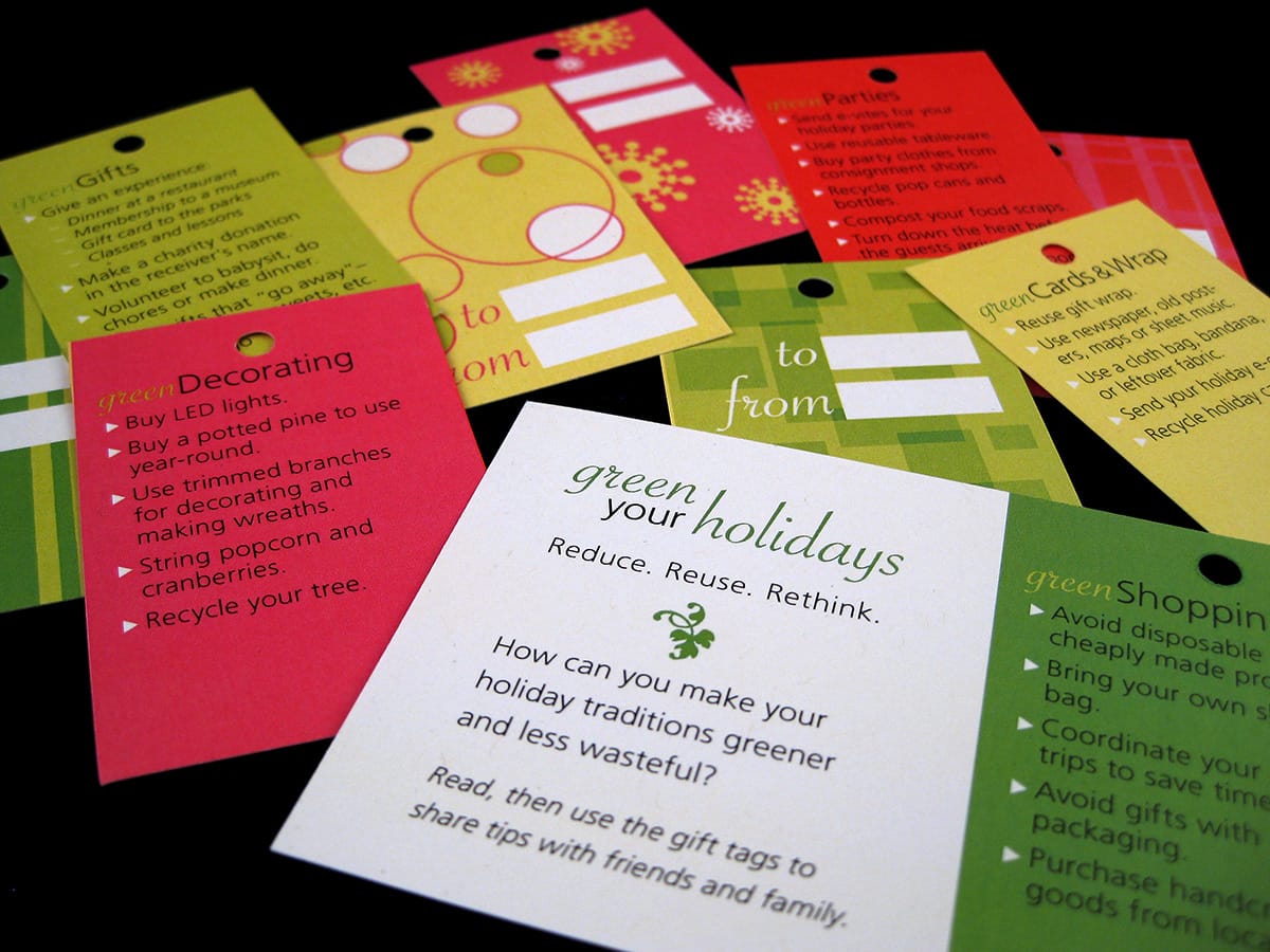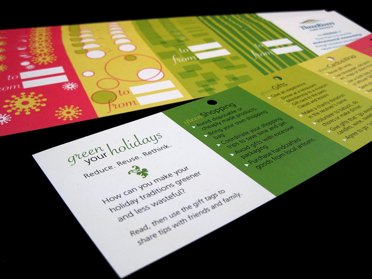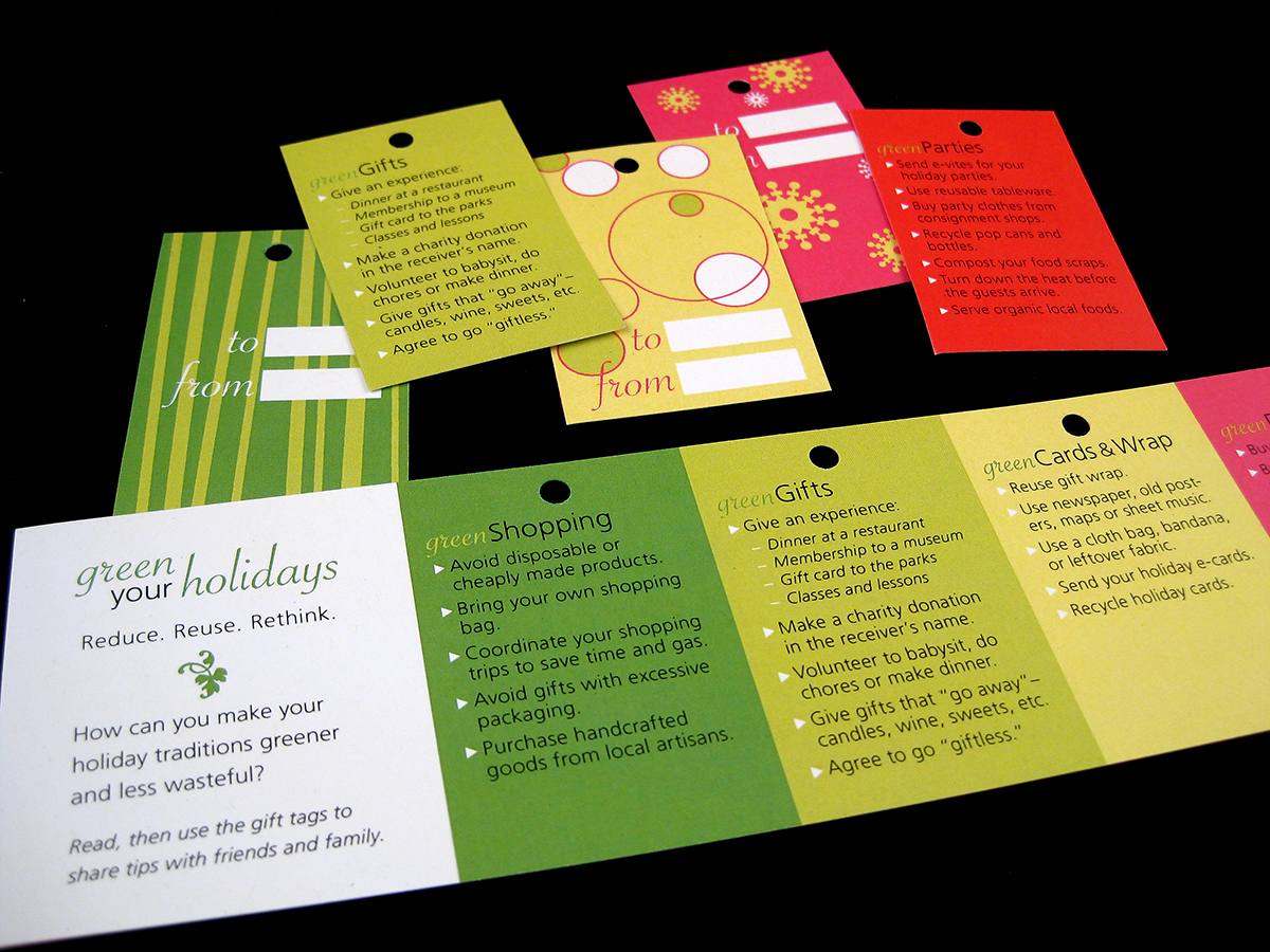 This playful, bookmark-sized piece offered tips for making holiday activities such as shopping, gift giving, decorating, and parties more sustainable. Each tip was printed on a gift tag that recipients could cut out and reuse, giving the piece a second life as both decoration and a way to share green messages with others.