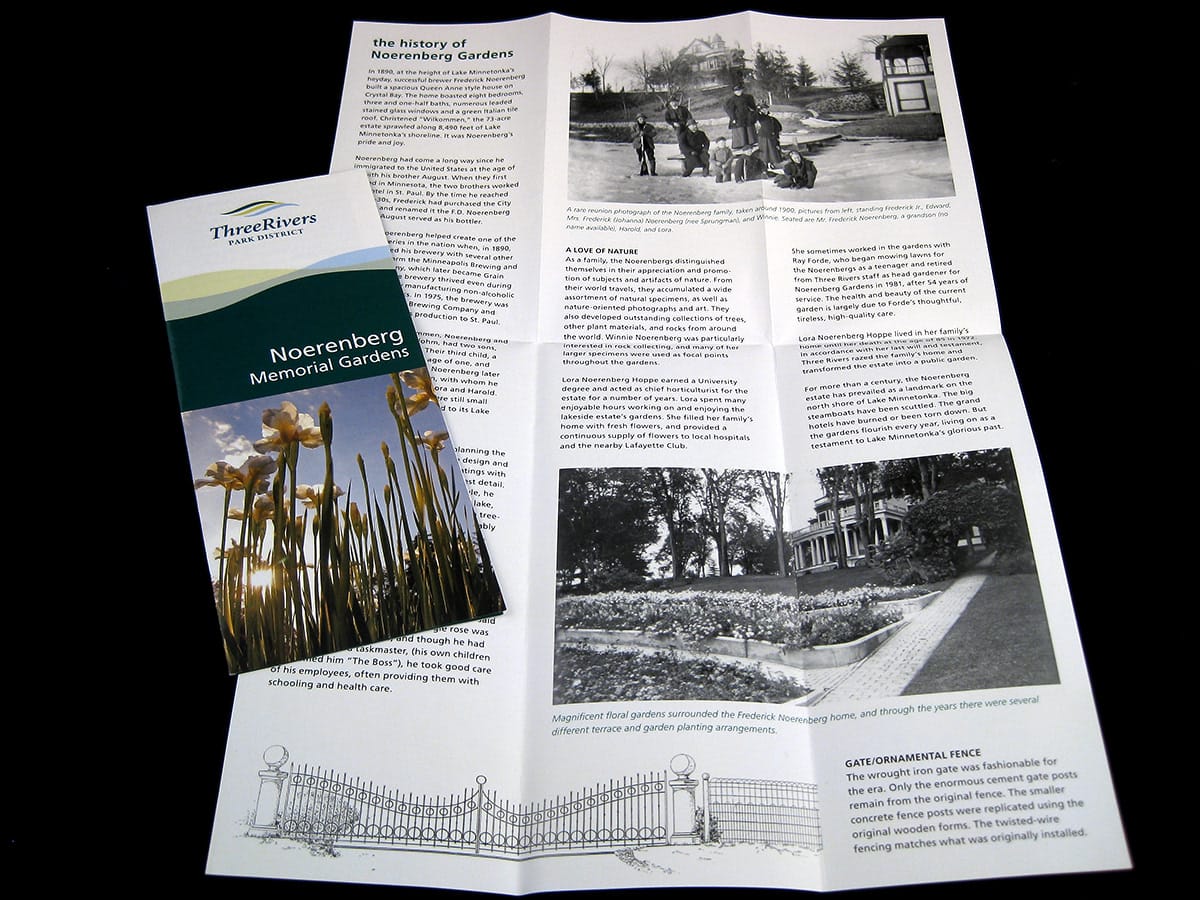 Self-guided tour brochure for Noerenberg Gardens highlighting plants and architectural features of a historical estate. Inside is a quick reference guide to the garden and estate features. Lifting a clever shortfold, the brochure expands into a poster revealing a detailed history of the property and the family that once lived there.