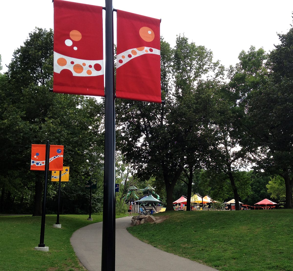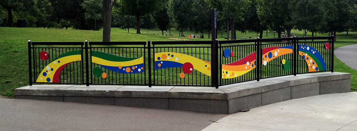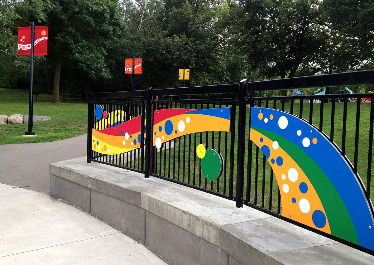 The new Elm Creek Play Area needed a visual connection between the parking lot and the partially hidden play zone. I designed banners and flowing fence graphics to guide visitors up the path and create a welcoming entrance. Using the play area’s bright color palette and signature ribbon and circle shapes, the graphics tied the site together into one cohesive experience.