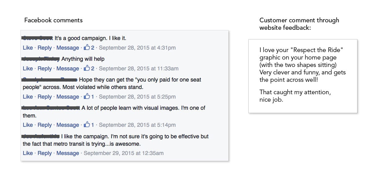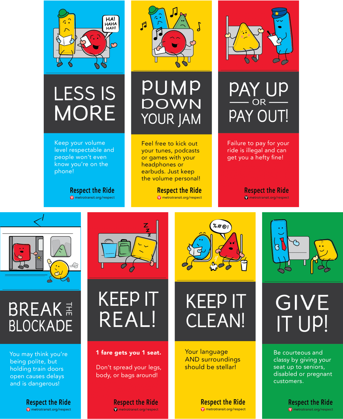 The Respect the Ride campaign aimed to address disruptive behaviors on Metro Transit buses and trains in a lighthearted, engaging way. Using basic shapes, I designed neutral characters whose emotions and actions tell the story without words. The campaign was applied across vehicles and supported by social media, successfully grabbing attention, encouraging positive behavior, and earning local press and awards.