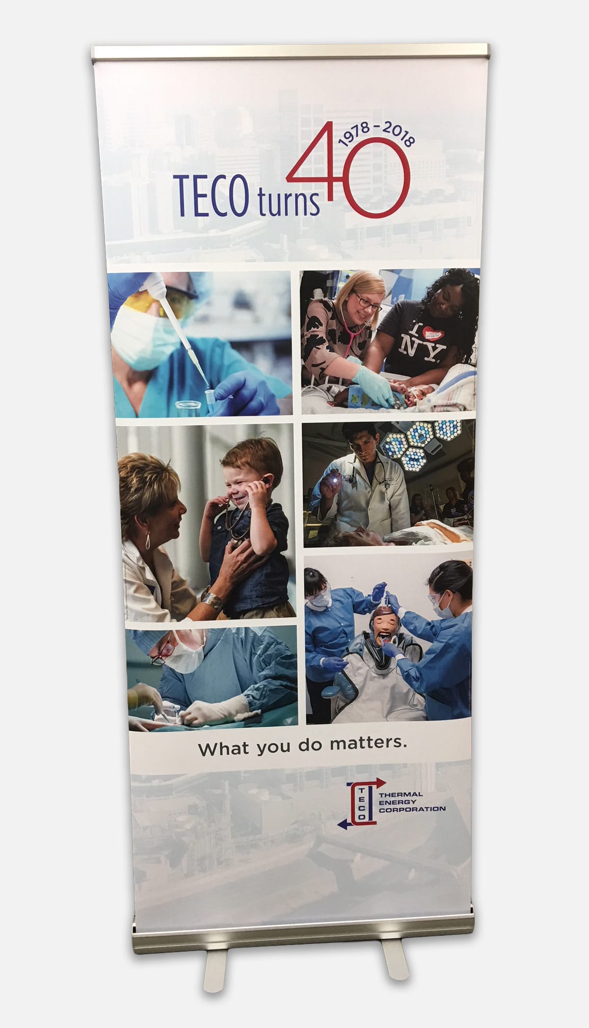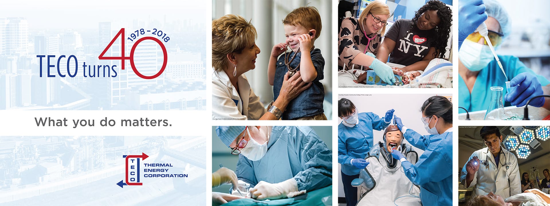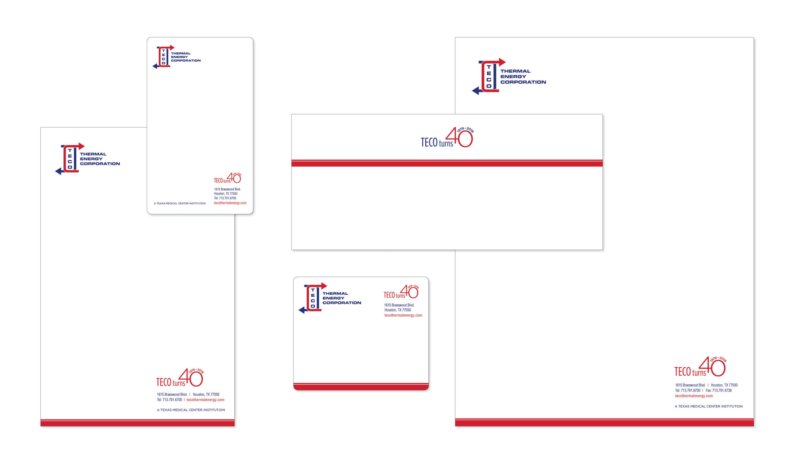 For its 40th anniversary, Thermal Energy Corporation (TECO) wanted to honor employees and highlight its role serving the Texas Medical Center. Partnering with Westerlund Communications, I designed a stylized “TECO turns 40” wordmark and applied it across email signatures, stationery, invoices, apparel, and even the company flag. Large banners teco-40th-banner1at building entrances welcomed staff with the message: What you do matters.