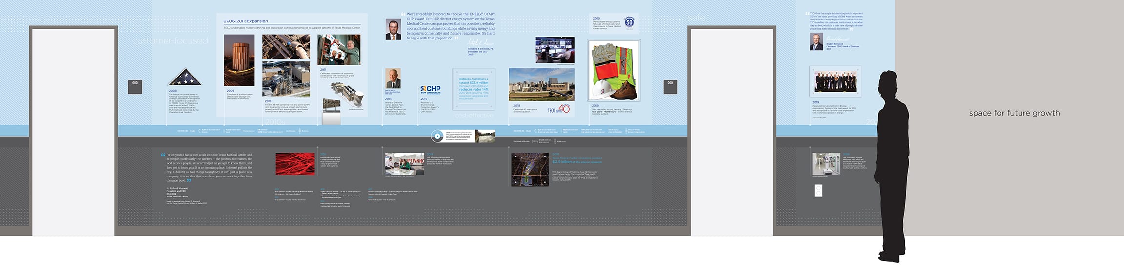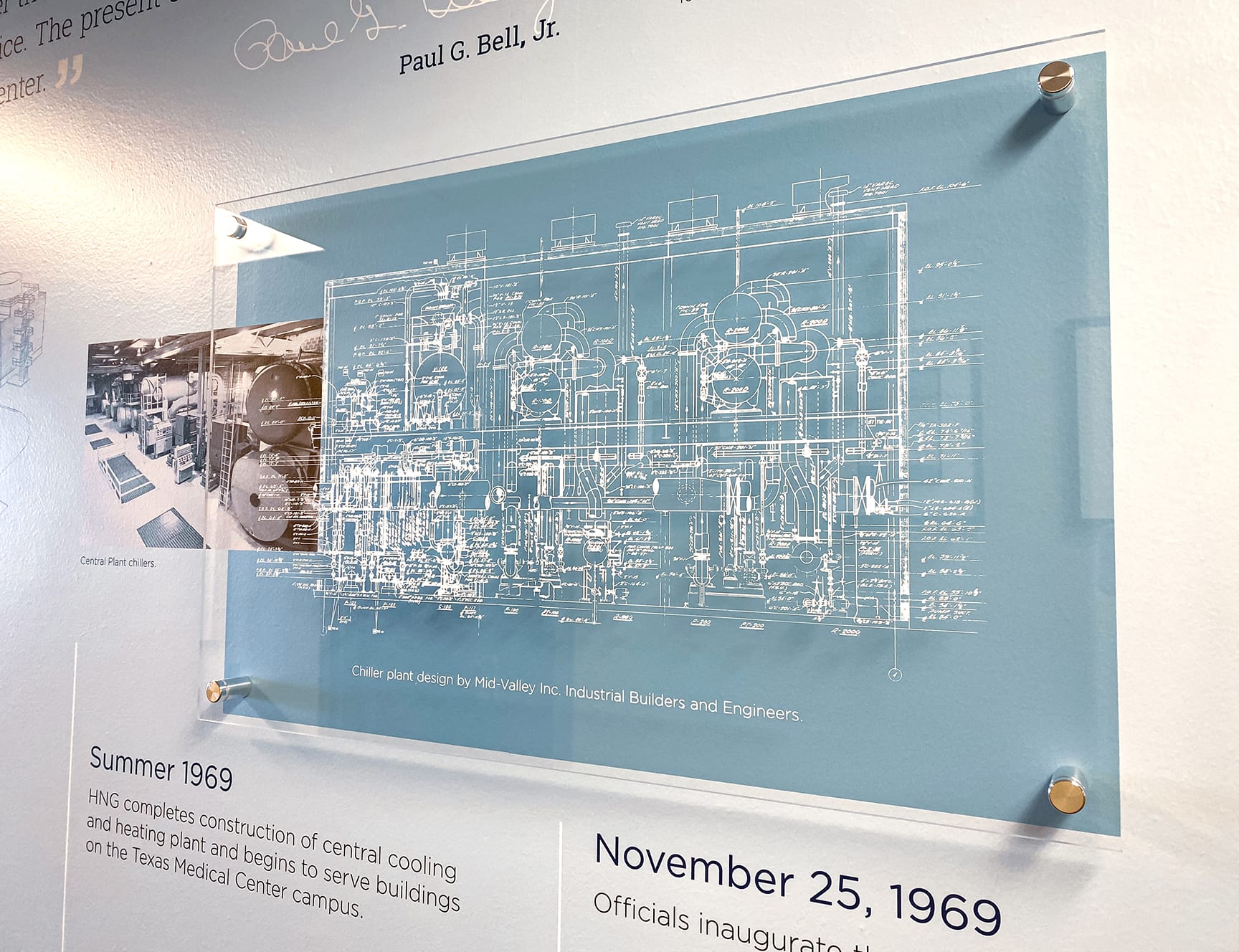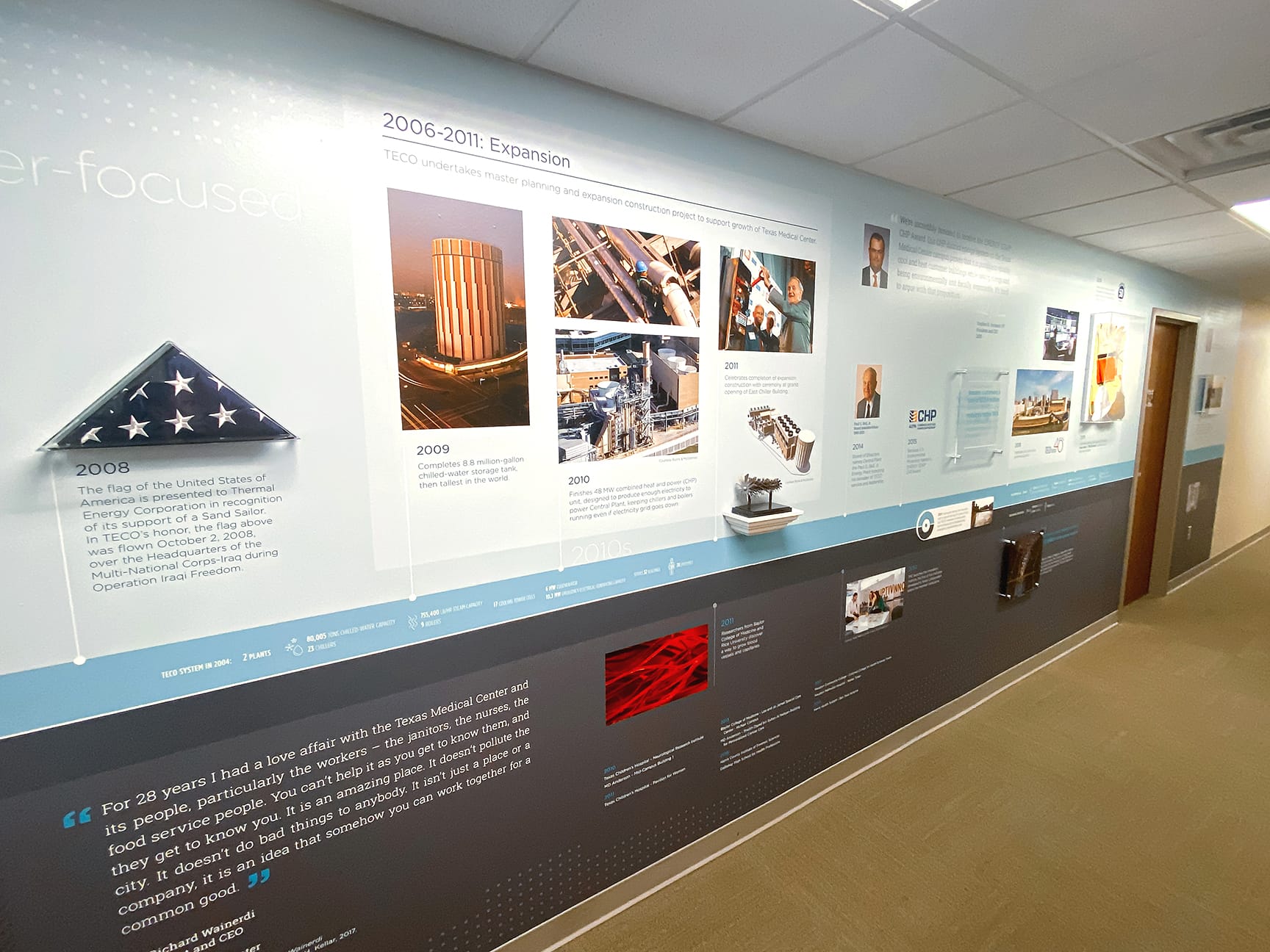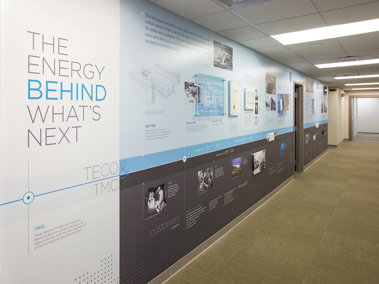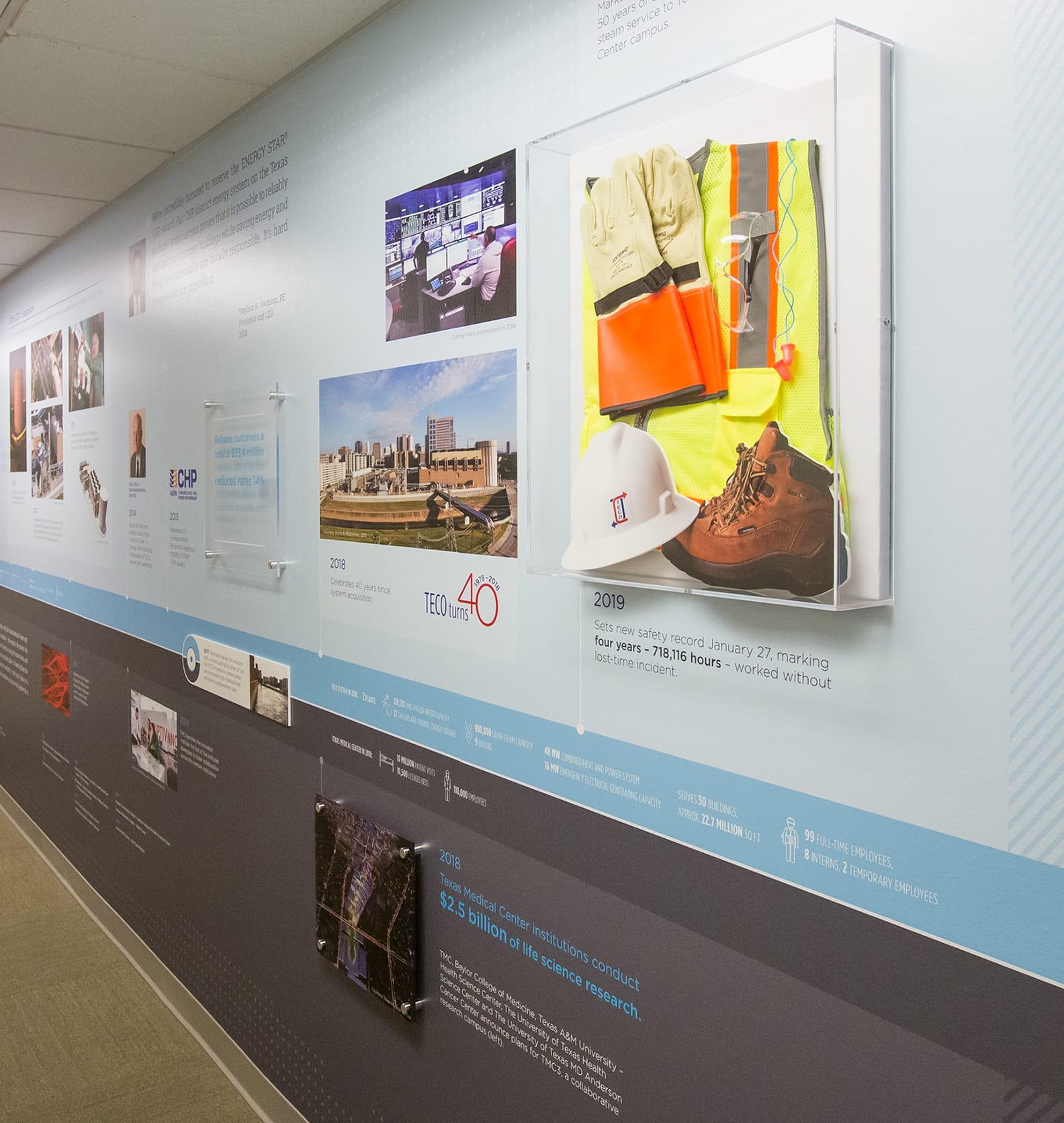 In 2019, Thermal Energy Corporation (TECO) commissioned a wall display to commemorate the 50th anniversary of its district energy system. Located next to the boardroom and executive offices, this impressive display spans 70 feet across two walls, using facts, quotes, and artifacts to tell the rich history of the company, its employees, and partner institutions. TECO proudly makes it a regular stop on their plant tours.