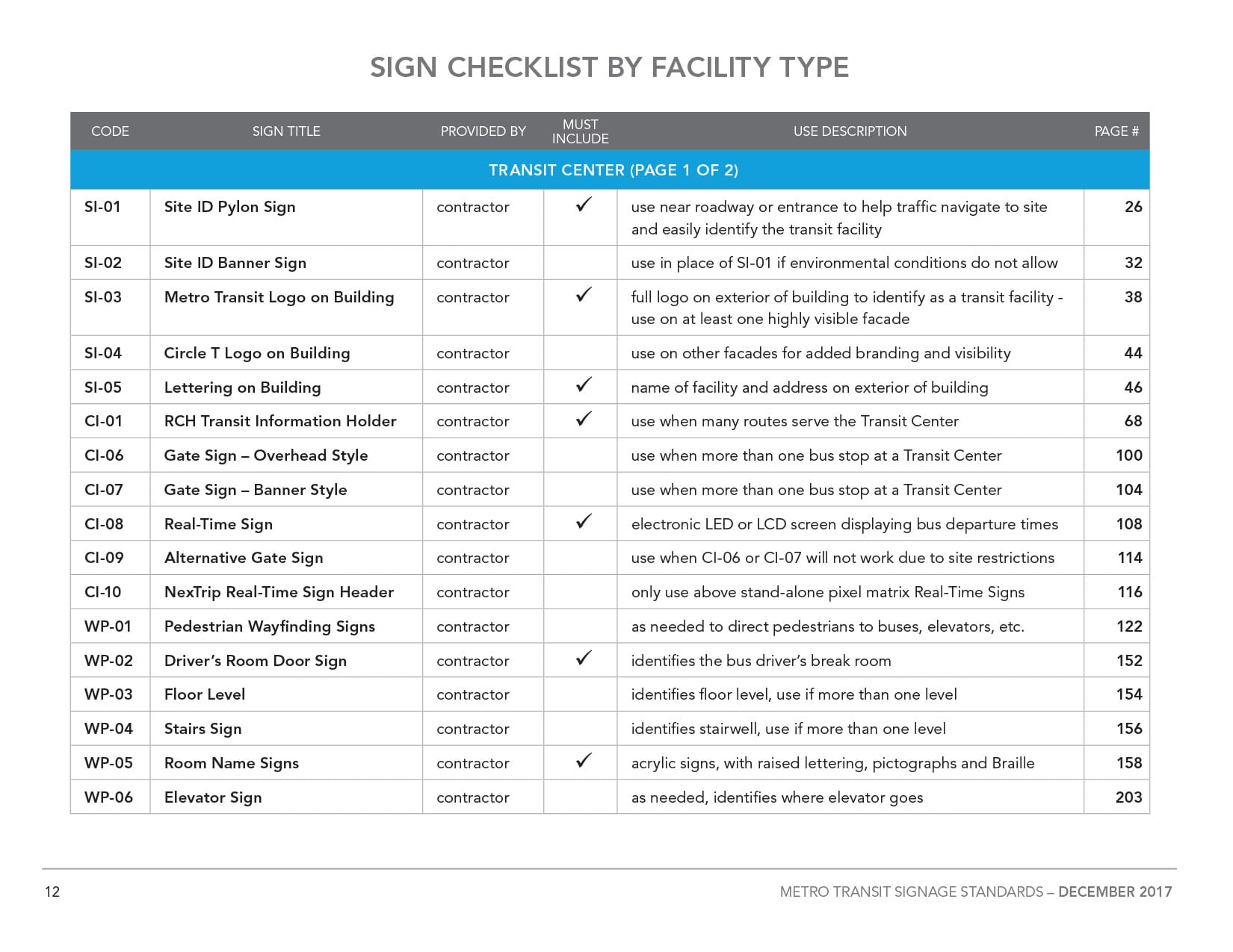 I made recommendations, led group discussions to resolve conflicts, and established standards for sign types, materials, text, sizes, and mounting. I also spent time in the field confirming placement and usage. The final manual provides planners with a reliable toolkit for every facility type, including photos, drawings, ADA requirements, and design templates. A coded system helps teams and vendors stay aligned, ensuring consistent signage and a smoother experience for riders across the system.