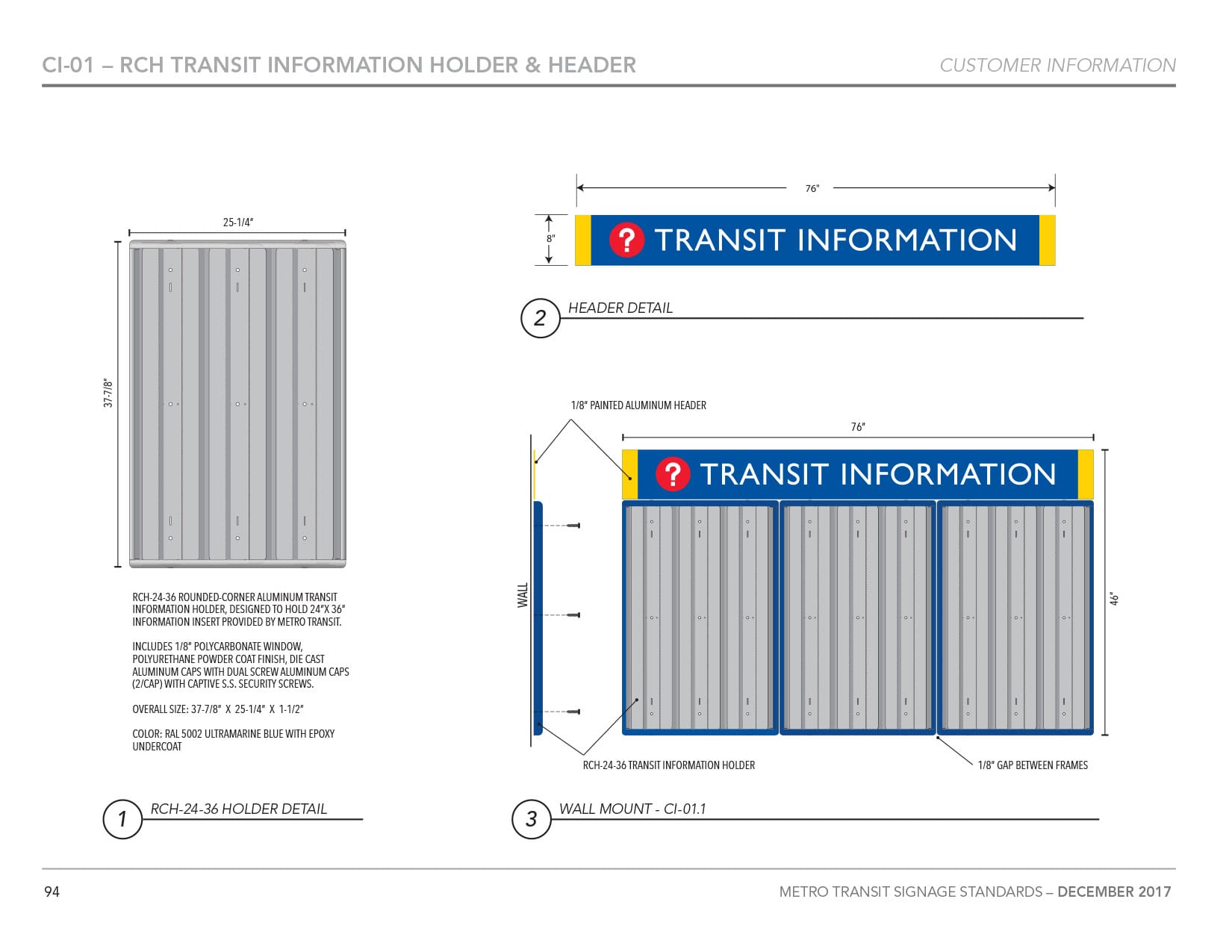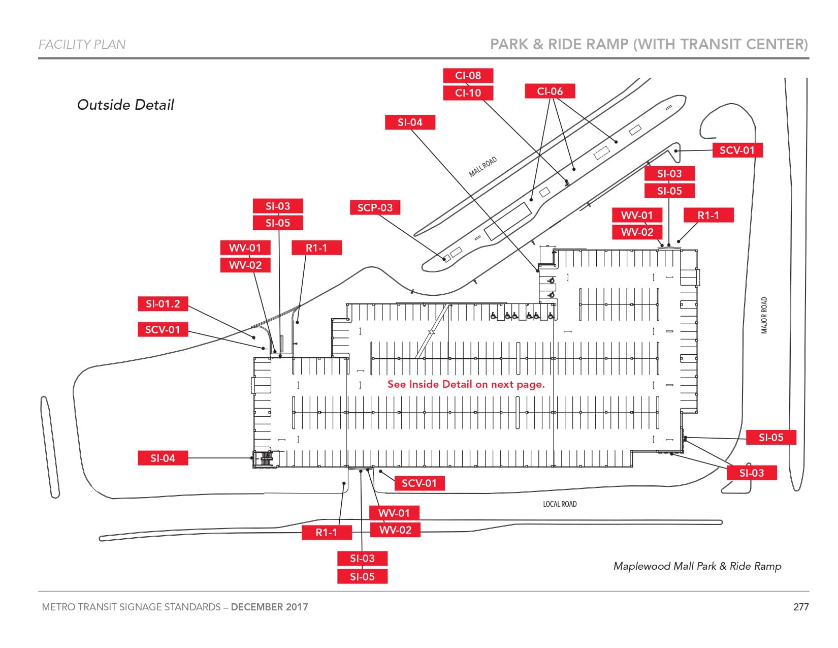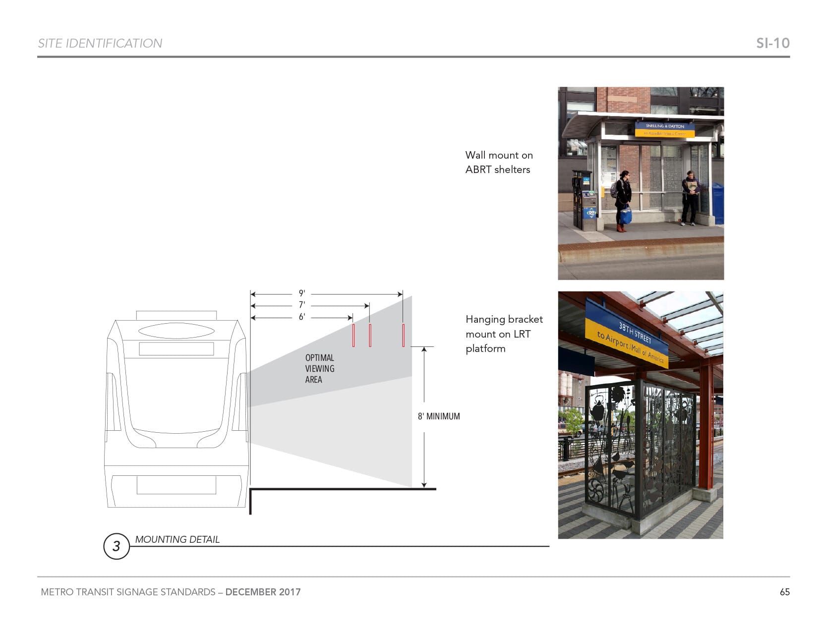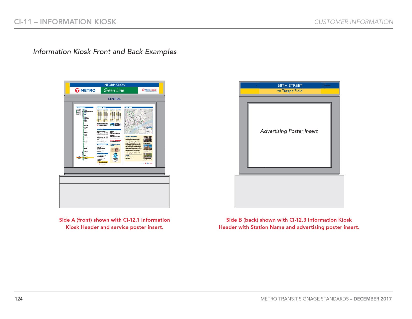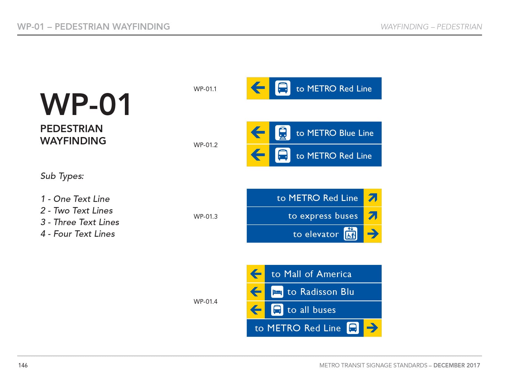 With no existing signage standards across Metro Transit facilities, I led the development of a 300-page wayfinding manual to bring clarity, consistency, and efficiency to the system. Previously, signage was handled project by project, creating inconsistent specs and ongoing challenges for planners and maintenance teams. I partnered with a junior engineer who audited stations and park-and-rides, gathering drawings and documentation. I verified specs, cleaned up drawings, and engaged key departments—including planning, engineering, maintenance, and transit services—to weigh in on everything from kiosk preferences to hardware.